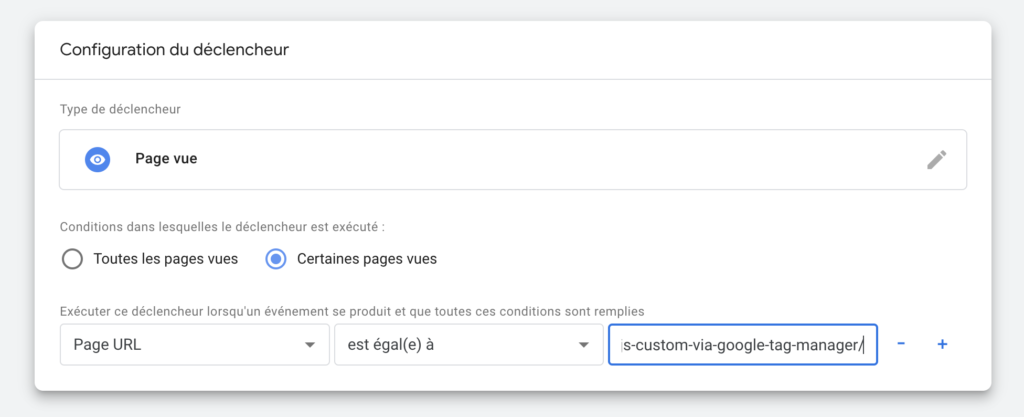 Tips : vous pouvez aussi cibler plus précisément les pages où vous voulez que le script soit intégré. Pour cela, créez un déclencheur « Page vue » en indiquant la ou les conditions.