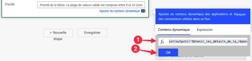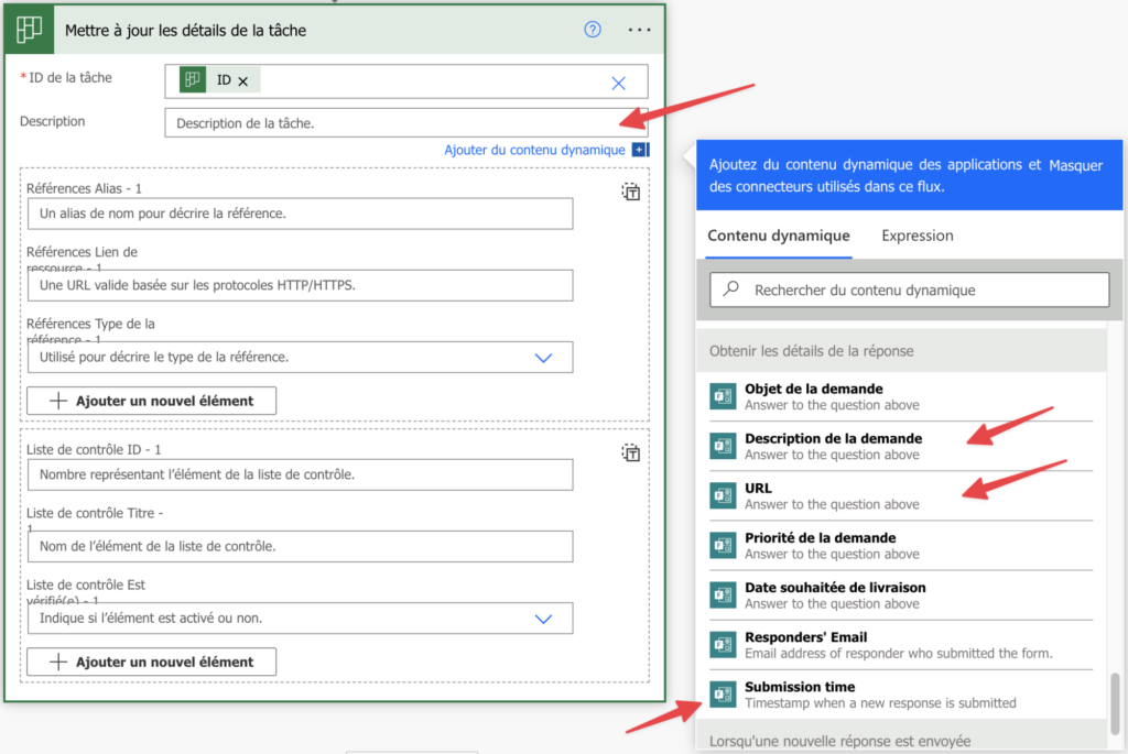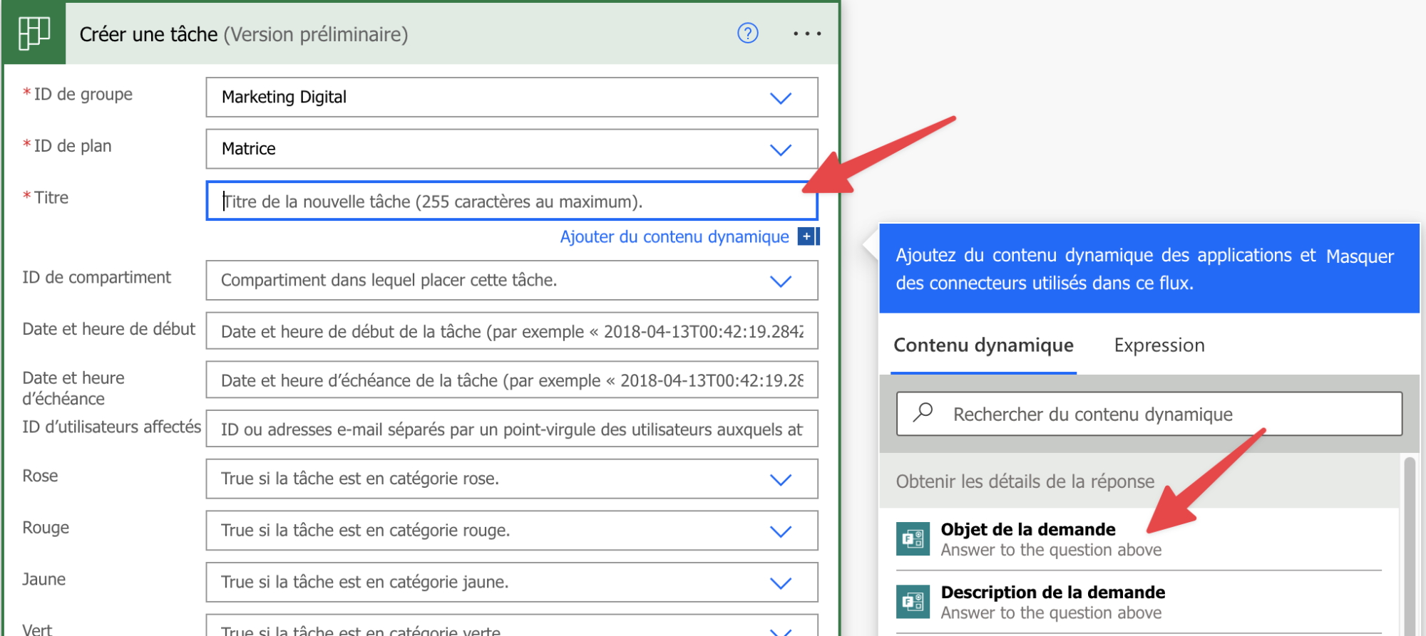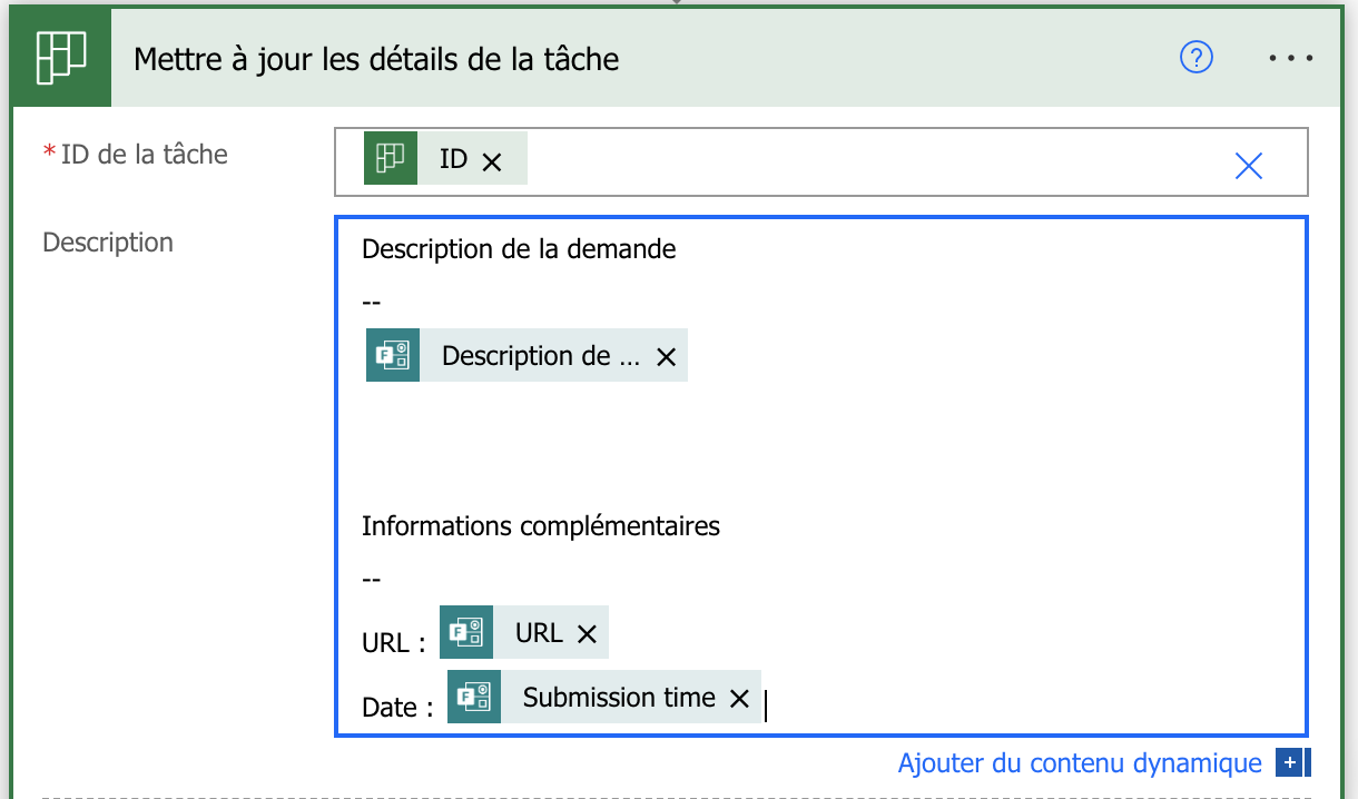 Ici, vous allez composer le contenu qui sera transmis au champ note de la tâche Planner. Vous pouvez l’éditer à votre guise, l’idée étant d’intégrer les deux derniers champs du formulaire que nous avons créé, à savoir : Description de la demande et URL.