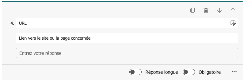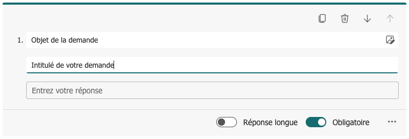 À présent rendez-vous sur Microsoft Forms et commencez la création de votre formulaire. Voici les éléments qu’il devra comporter. Attention aux libellés que vous choisissez, ce seront les noms des variables que vous manipulerez par la suite dans Power Automate.