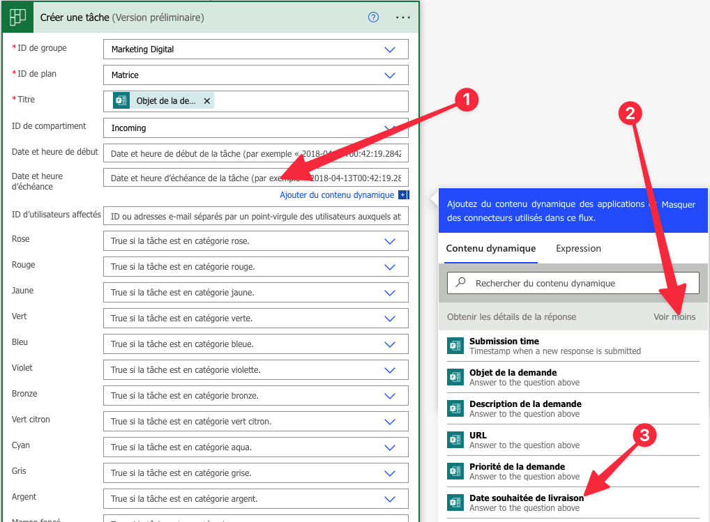 Cliquez sur le champs Date et heure d’échéance (1), puis dans le volet qui s’ouvre, cliquez sur Voir plus (2) pour afficher la liste des valeurs issues du formulaire. Choisissez Date souhaitée de livraison (3).