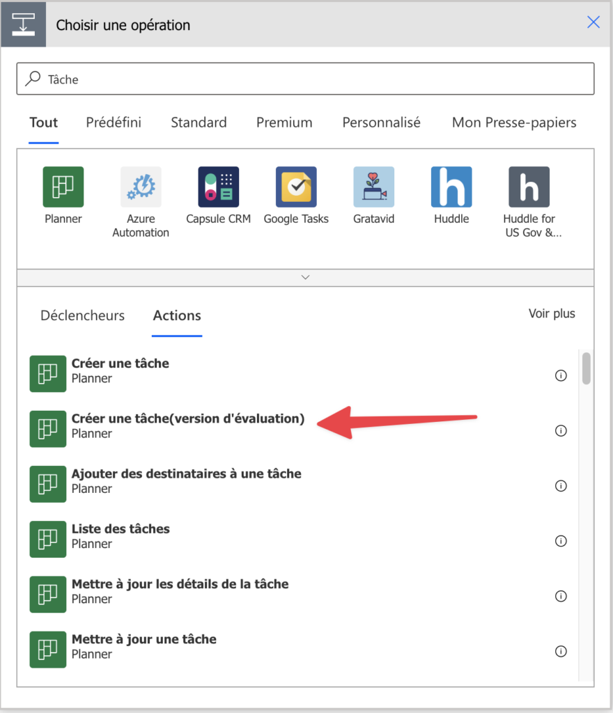 Vous devriez voir s’afficher l’action Créer une tâche (version d’évaludation). Sélectionnez-là.