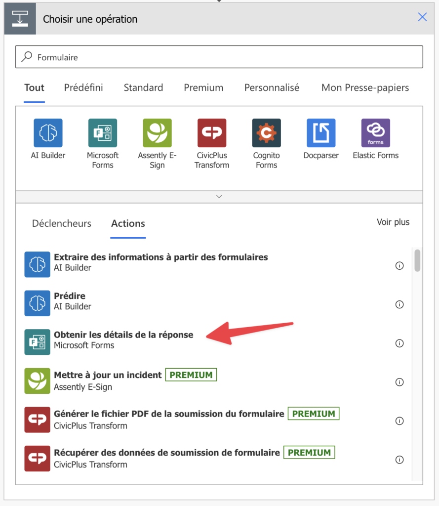 Vous devriez voir s’afficher l’action Obtenir les détails de la réponse. Sélectionnez-là.