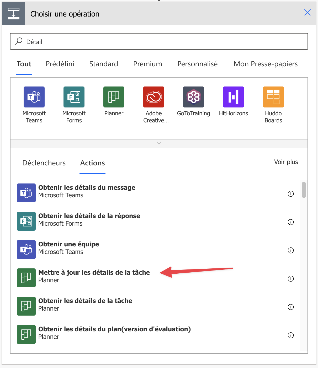 Cliquez sur Nouvelle étape, le bloc Choisir une opération s’affiche, cherchez le mot-clé Détail.