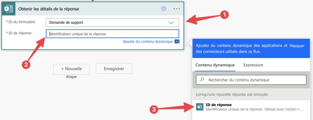 Dans le bloc qui s’affiche, renseignez à nouveau le formulaire concerné (1) et cliquez sur ID de réponse (2). Un volet s’ouvre sur le côté et vous propose d’ajouter soit des contenus dynamiques, soit une expression. À ce stade, vous n’avez encore aucun contenu à disposition (vous pourrez en créer) mis à part ID de réponse (3). Et c’est cette valeur qu’il faut sélectionner.