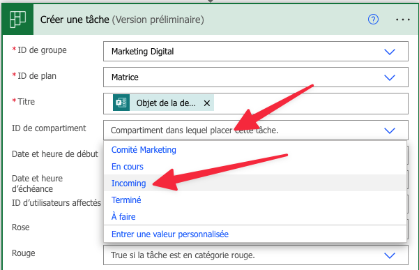 Identifiez le compartiment de votre tableau qui accueillera les tâches qui seront créées par Power Automate.