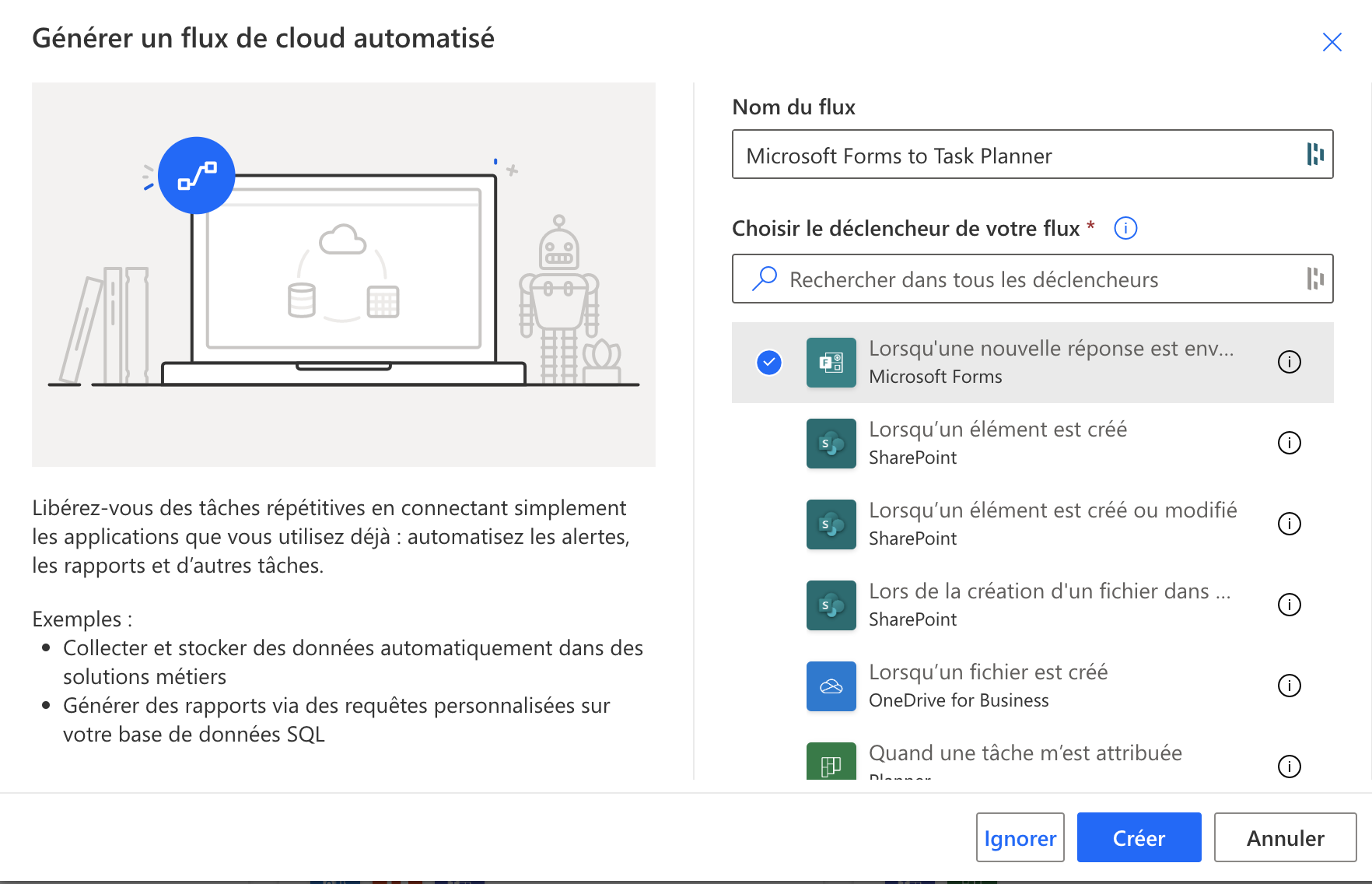 Dans le menu, allez dans Créer, Démarrer à partir de zéro, Flux de cloud automatisé. Dans la popin qui s’affiche, saisissez le nom de votre flux, par exemple Microsoft Forms to Task Planner. Indiquez ensuite le déclencheur qui est la réponse apportée à un formulaire.
