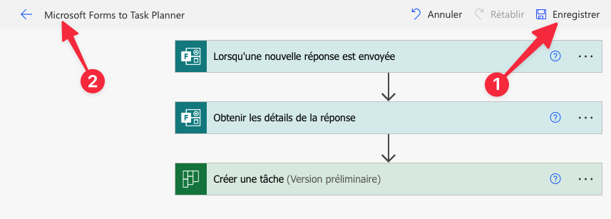 Enregistrez le flux (1) et retourner à la page de gestion (2).