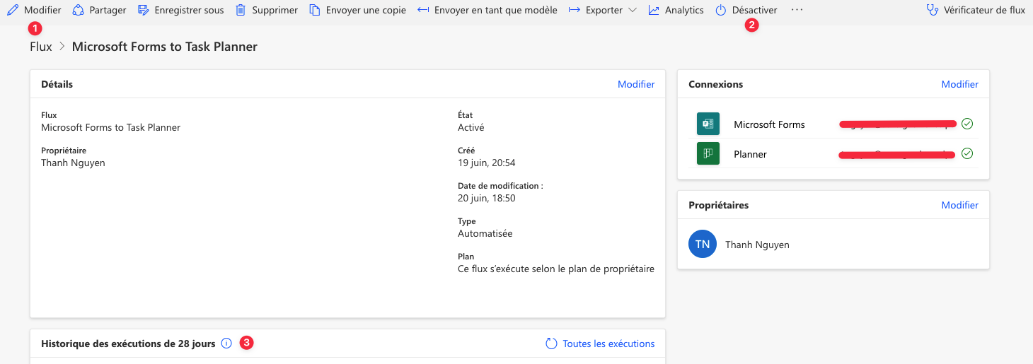 Et maintenant, testez votre formulaire. Pour voir si votre flux Power Automate a bien fonctionné, vous pouvez vous référer à l’historique ou bien vous rendre directement sur votre compartiment du Planner et vérifier la création de la tâche.