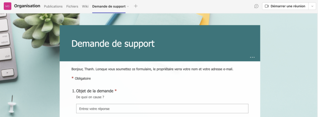 […] nous avons vu comment créer une tâche dans Planner à partir des données de Microsoft Forms. Ce flux nous a servi à mettre en place un formulaire de demande de support. Nous allons repartir […]