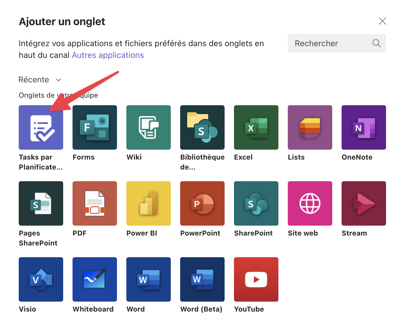 Rendez-vous dans l’équipe et le canal où vous désirez mettre à disposition votre tableau Planner, et cliquez sur le picto « + » pour ajouter un onglet.