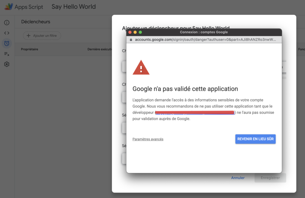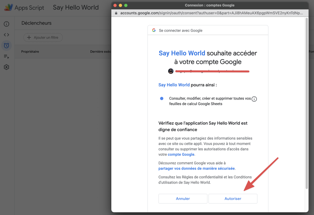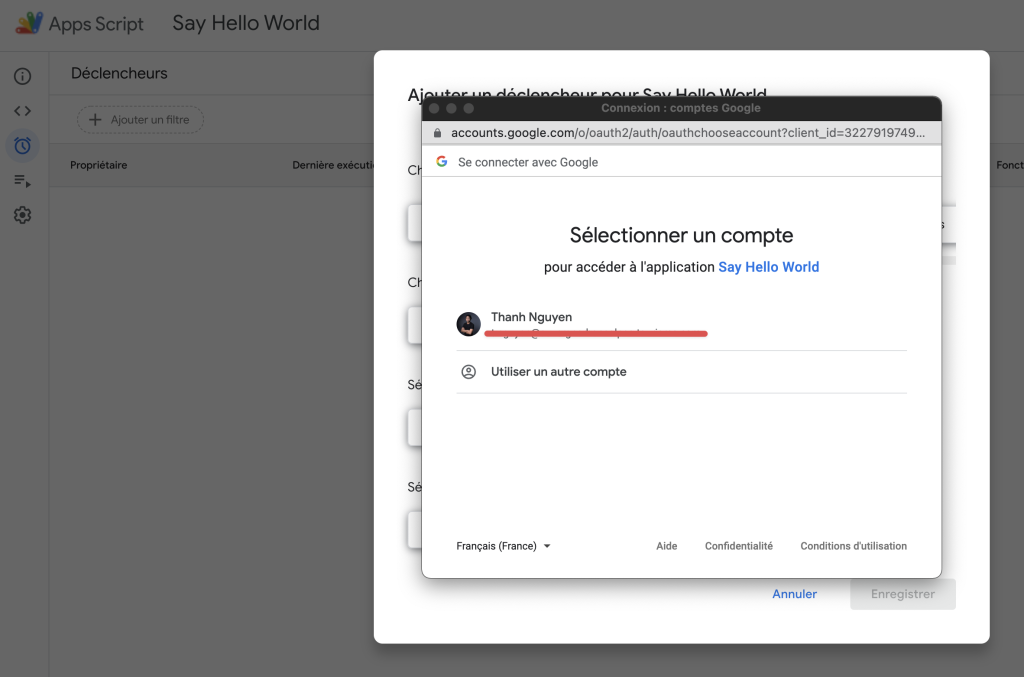Vérifiez les informations, à savoir la fonction à exécuter et le type d’événement À l’ouverture. Enregistrez les paramètres et dans l’écran qui suit, vous devez donner l’accès de votre projet à votre compte Google.