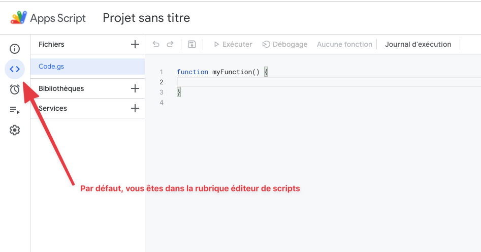Un nouvel onglet s’ouvre et vous voilà dans l’interface Apps Scripts.