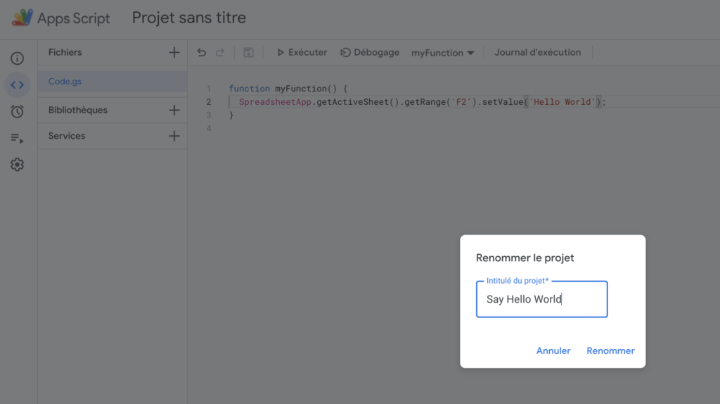 Nous allons ajouter une instruction à réaliser, affichons Hello World dans la cellule F2. Pour cela, modifiez la fonction myFunction présente par défaut.