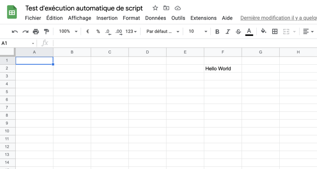 Retournez à présent sur votre Google Sheets et actualisez la page. Vous devriez voir s’afficher Hello World dans la cellule F2.