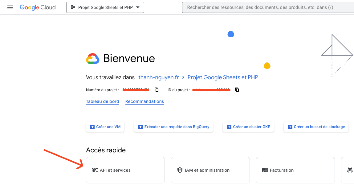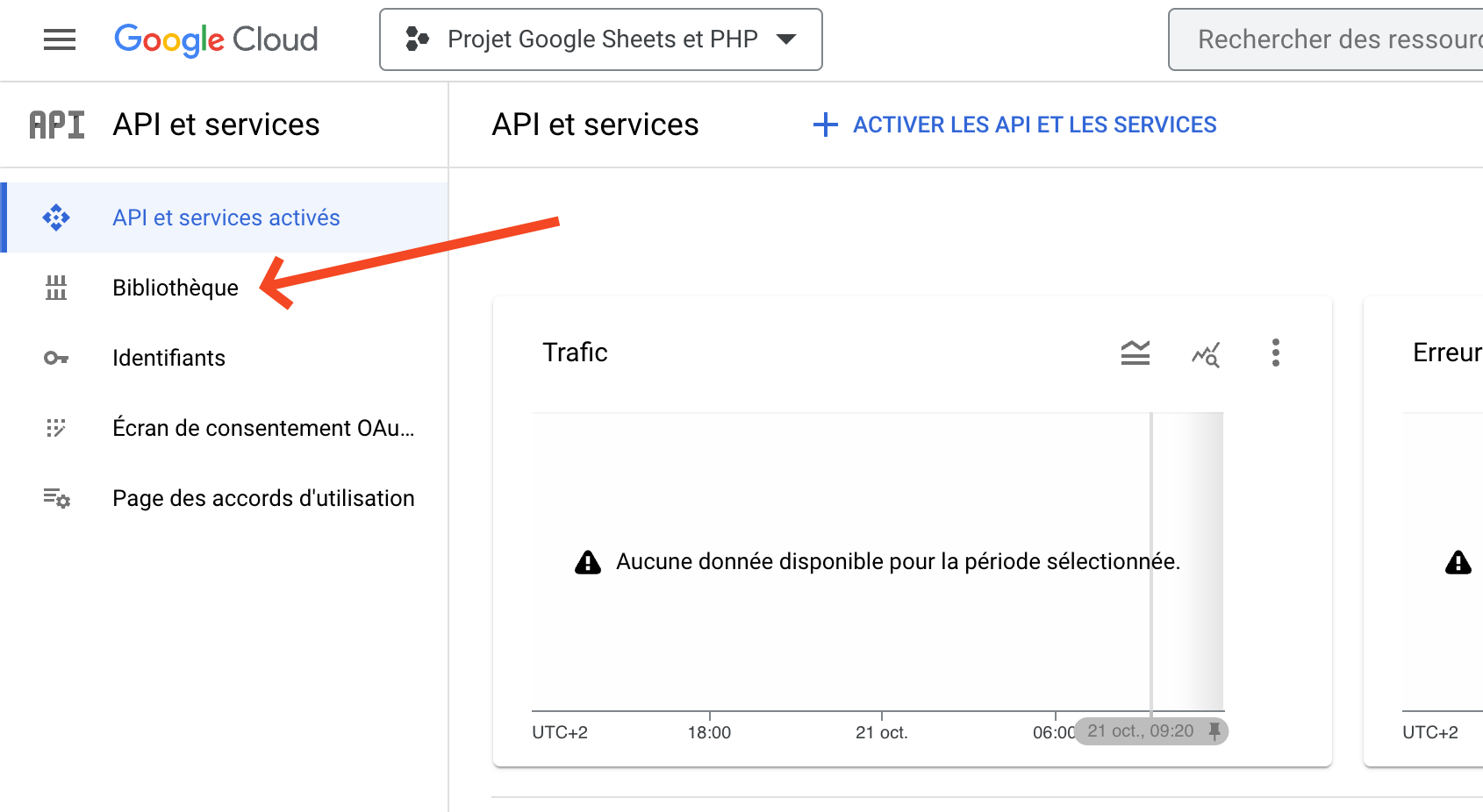 Depuis la page d’accueil de votre projet, allez dans la rubrique API et services puis dans la bibliothèque d’API. Si vous ne trouvez pas la page d’accueil, cliquez sur le logo Google Cloud.