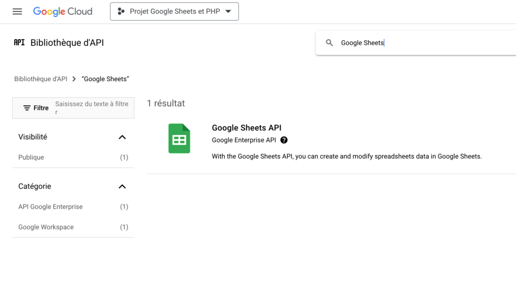 Dans le champs de recherche, saisissez Google Sheets et sélectionnez l’API désirée et activez-la.