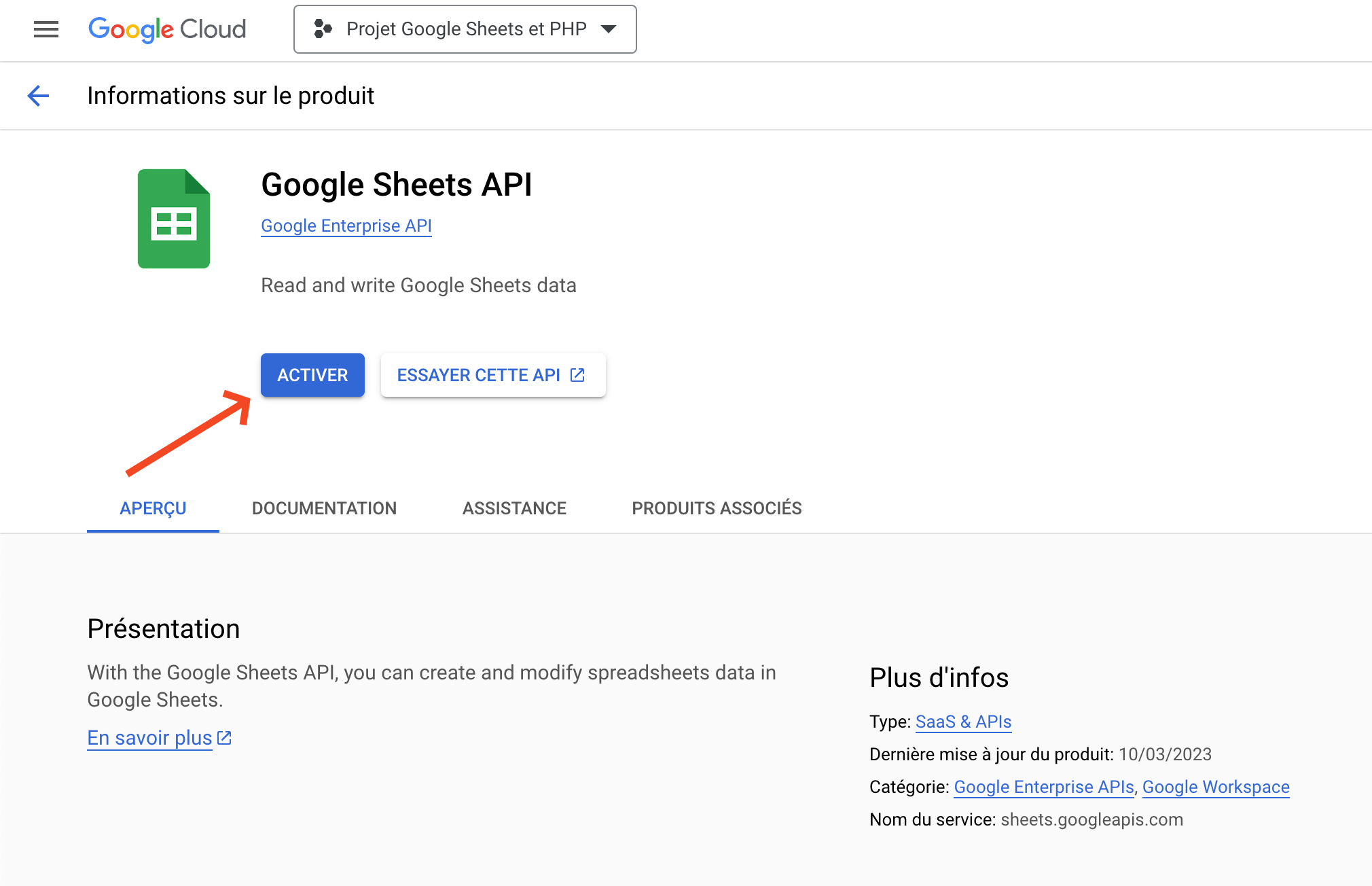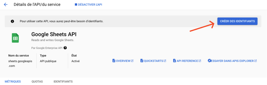 Une fois l’API Google Sheets associée à votre projet, vous pouvez accéder à un tableau de bord spécifique à la gestion du service.