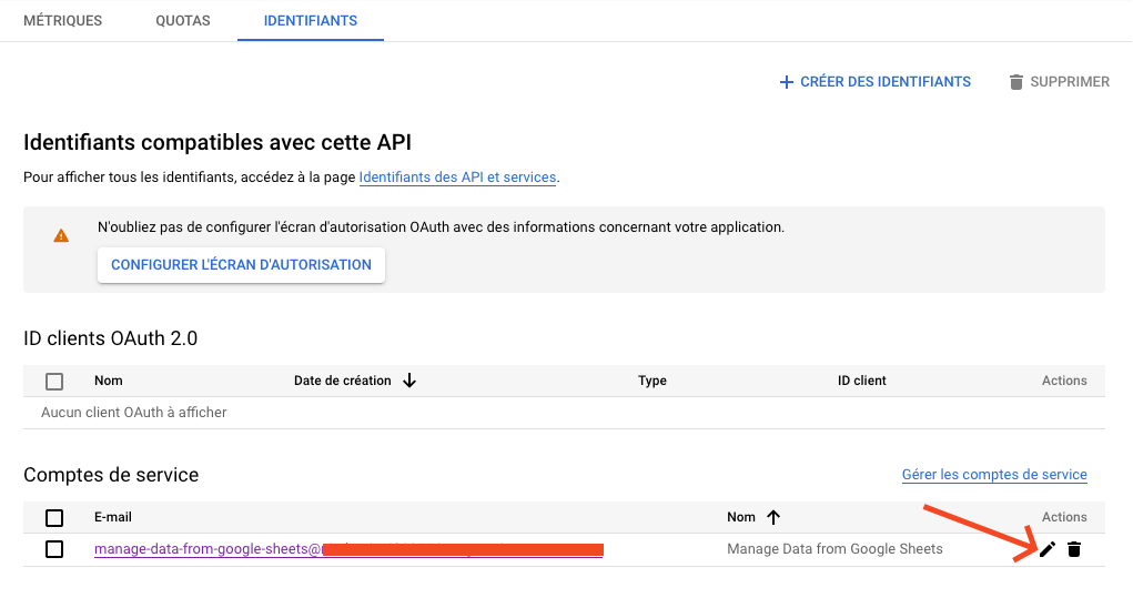 Au niveau du tableau de bord de l’API, dans la rubrique Compte de service, cliquez sur le compte que vous venez de créer.