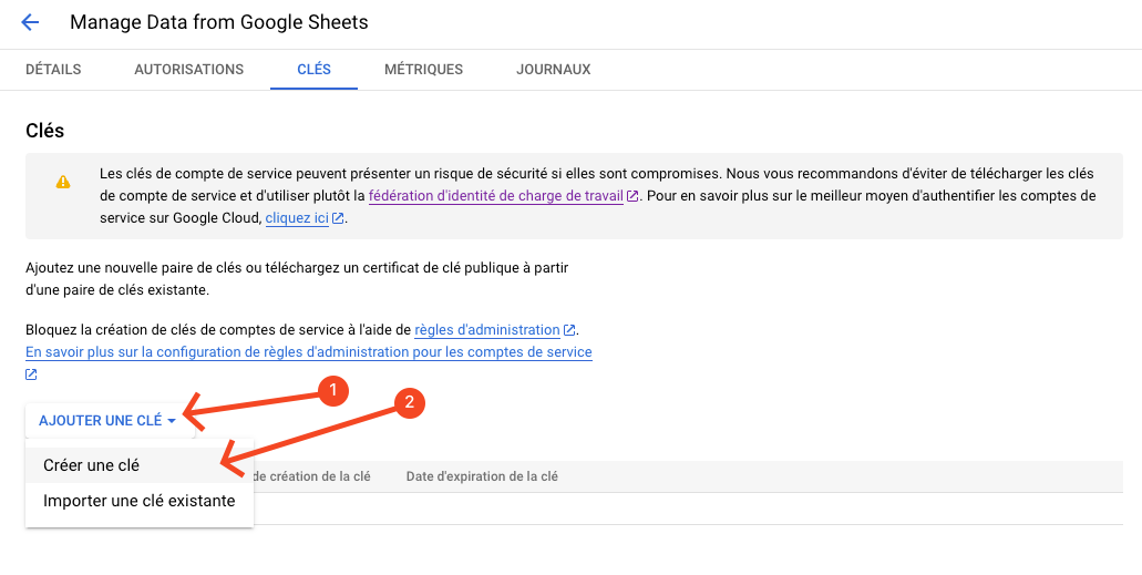 Dans le cadre de ce tutoriel, nous n’allons pas aborder l’authentification via OAuth et nous allons utiliser une clé de compte de service.