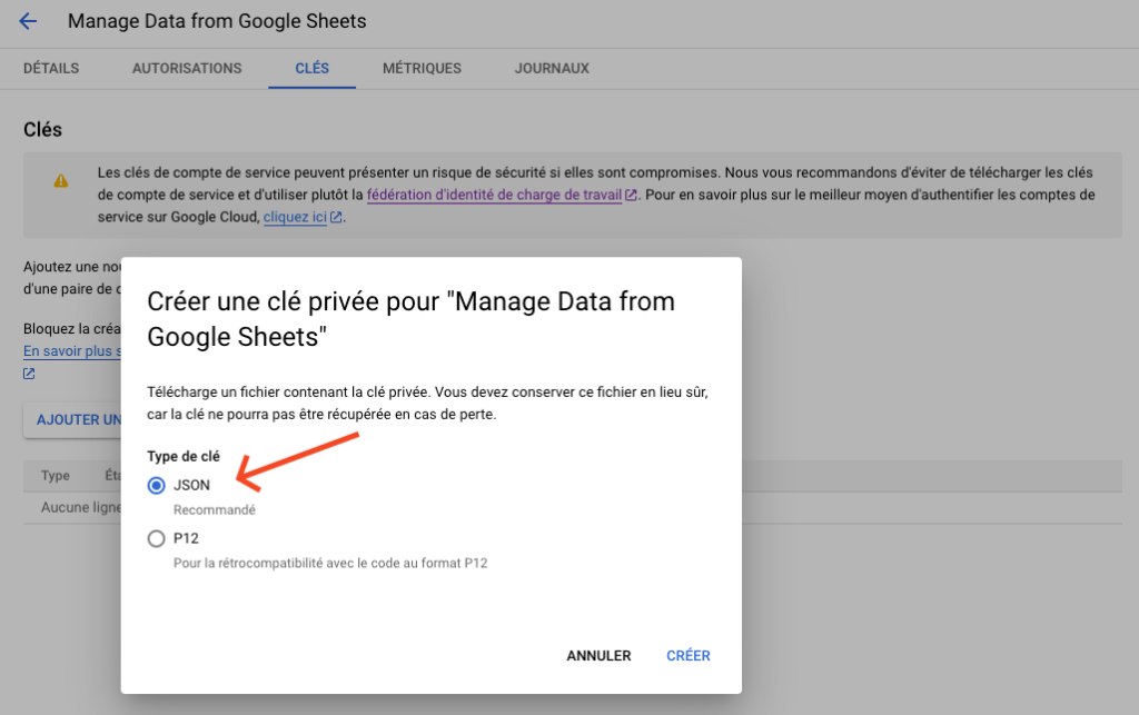 Une popin apparait et vous demande quelle type de clé vous voulez créer. Sélectionner JSON, et cliquez sur Créer.