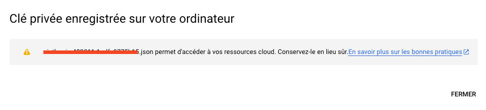 La création de la clé entraine le téléchargement d’un fichier JSON d’authentification qu’il conviendra de sauvegarder. Nous l’utiliserons plus tard lors des requêtes à l’API.