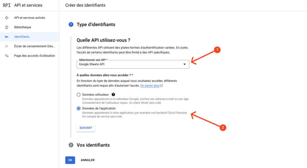 Dans la tableau de bord de l’API, cliquez sur Créer des identifiants.