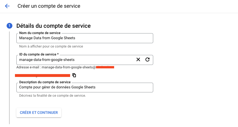 La création d’un compte de service génère une adresse e-mail qui va reprendre l’ID du compte de service. Notez l’adresse e-mail générée.