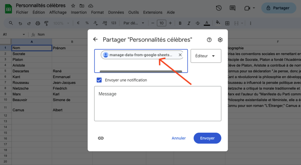 Allez ensuite sur votre la feuille de calcul Google Sheet et partagez-la avec l’adresse e-mail générée.
