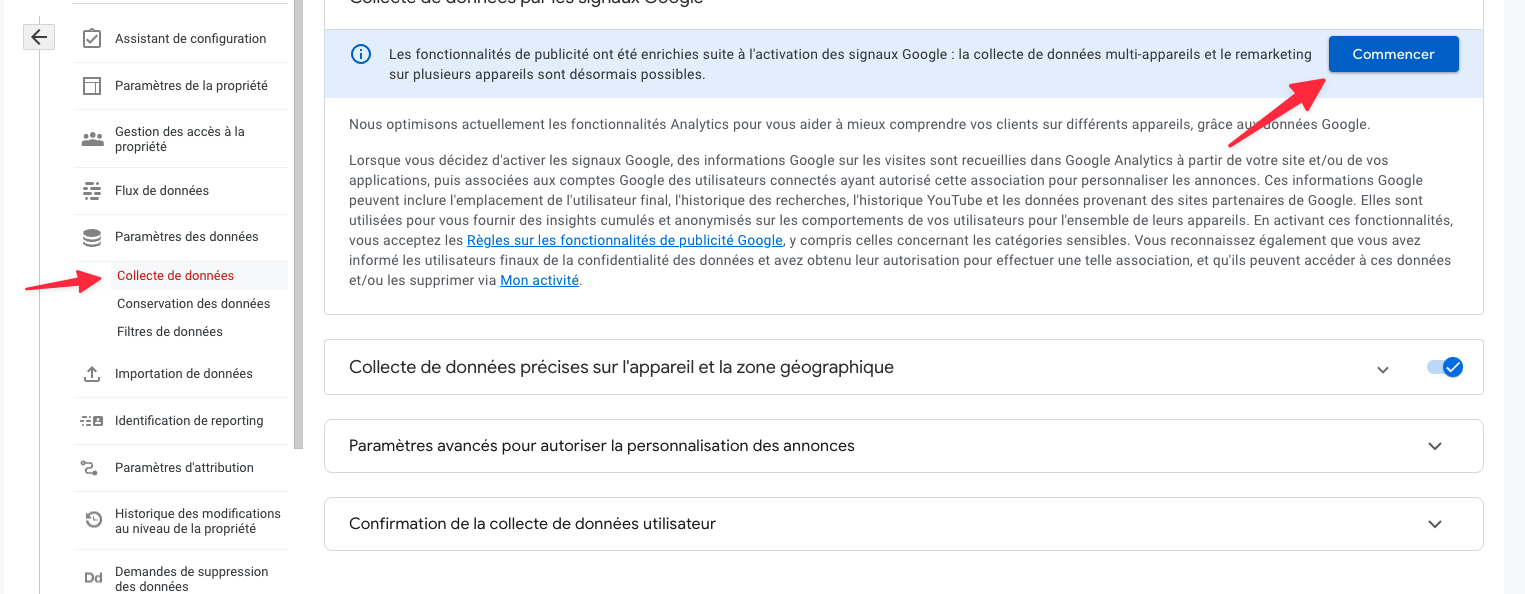 Rendez-vous dans le module d’administration Google Analytics, sélectionnez votre propriété. Puis allez dans Paramètres des données, puis Collecte des données.