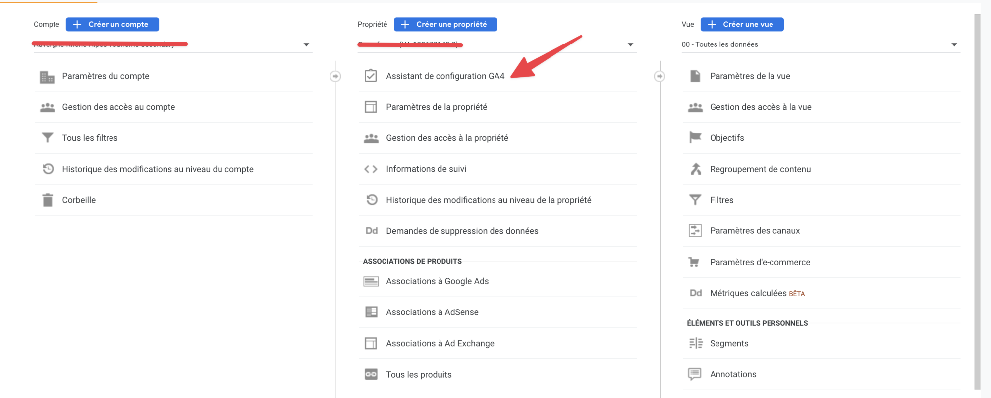 Pour créer une propriété GA4 à partir d’une propriété UA existante, rendez-vous dans l’administration Google et sélectionnez la propriété.