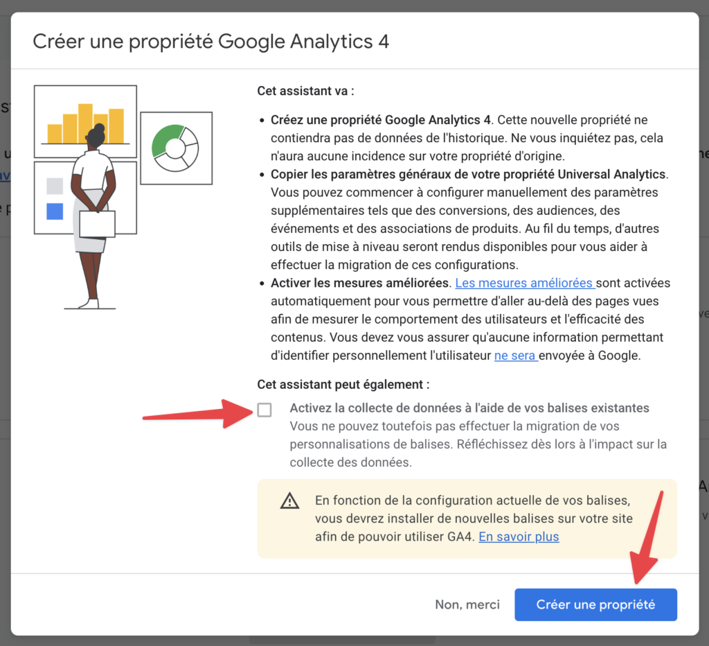 Dans l’étape d’après, il vous est proposé de collecter les données pour GA4 avec les balises déjà en place sur votre site et que vous avez déjà configuré pour collecter les données pour UA. Je vous conseille de désactiver cette possibilité. Nous verrons ci-dessous comment installer le tracking GA4 de façon indépendante.