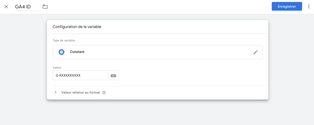 - Par précaution nous allons donner une valeur par défaut à la variable, déroulez le bloc Valeur relative au format