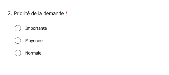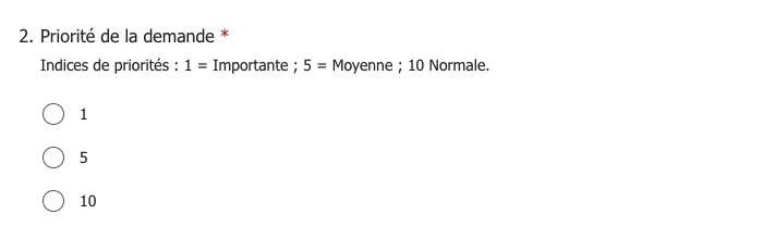 Dans notre formulaire Microsoft Forms, nous avions demandé à l’utilisateur de sélectionner la priorité via des champs de type radio avec pour valeurs 1, 5 et 10.