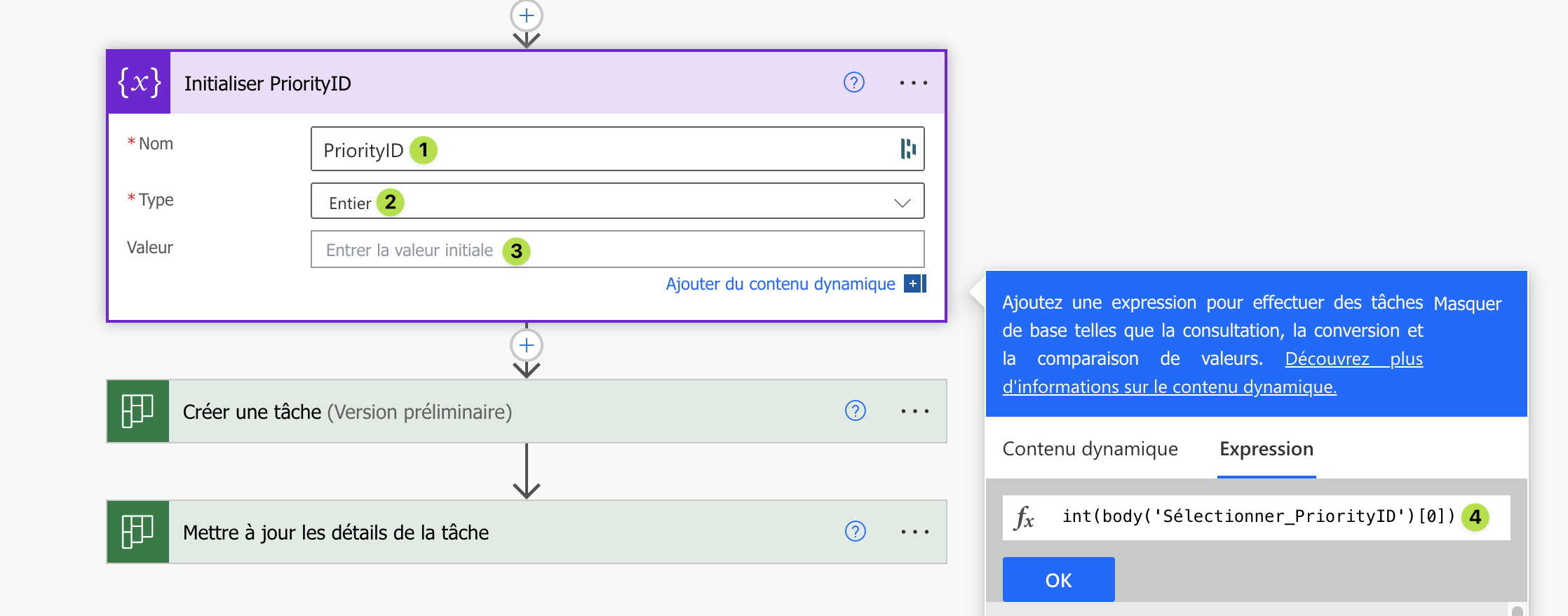 Nous allons initialiser une variable de type entier (2) nommée PriorityID (1), cliquez sur le champs Valeur et saisissez l’expression suivante (4) :