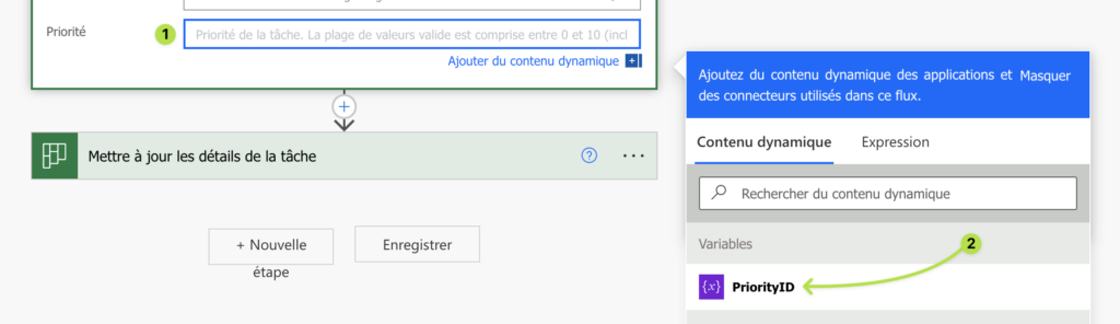 Dépliez l’action Créer une tâche, rendez-vous tout en bas du bloc et dans le champ Priorité (1), sélectionnez la variable PriorityID précédemment créée (2). Vous pouvez aussi l’atteindre avec l’expression suivante :