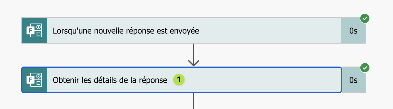 Retournez sur la page d’accueil du flux, rendez-vous sur le bloc Historique des exécutions de 28 jours et affichez le détail de l’exécution d’un des flux. Le diagramme complet s’affiche et l’information qui nous intéresse se trouve dans le bloc Obtenir les détails de la réponse (1).
