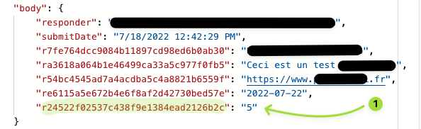 Lorsqu’on déplie le bloc, on peut voir les données transmises via le formulaire Microsoft Forms, cliquez sur Afficher les sorties brutes. Un volet affiche alors les détails de la réponse au format JSON, repérez les informations relatives au body.