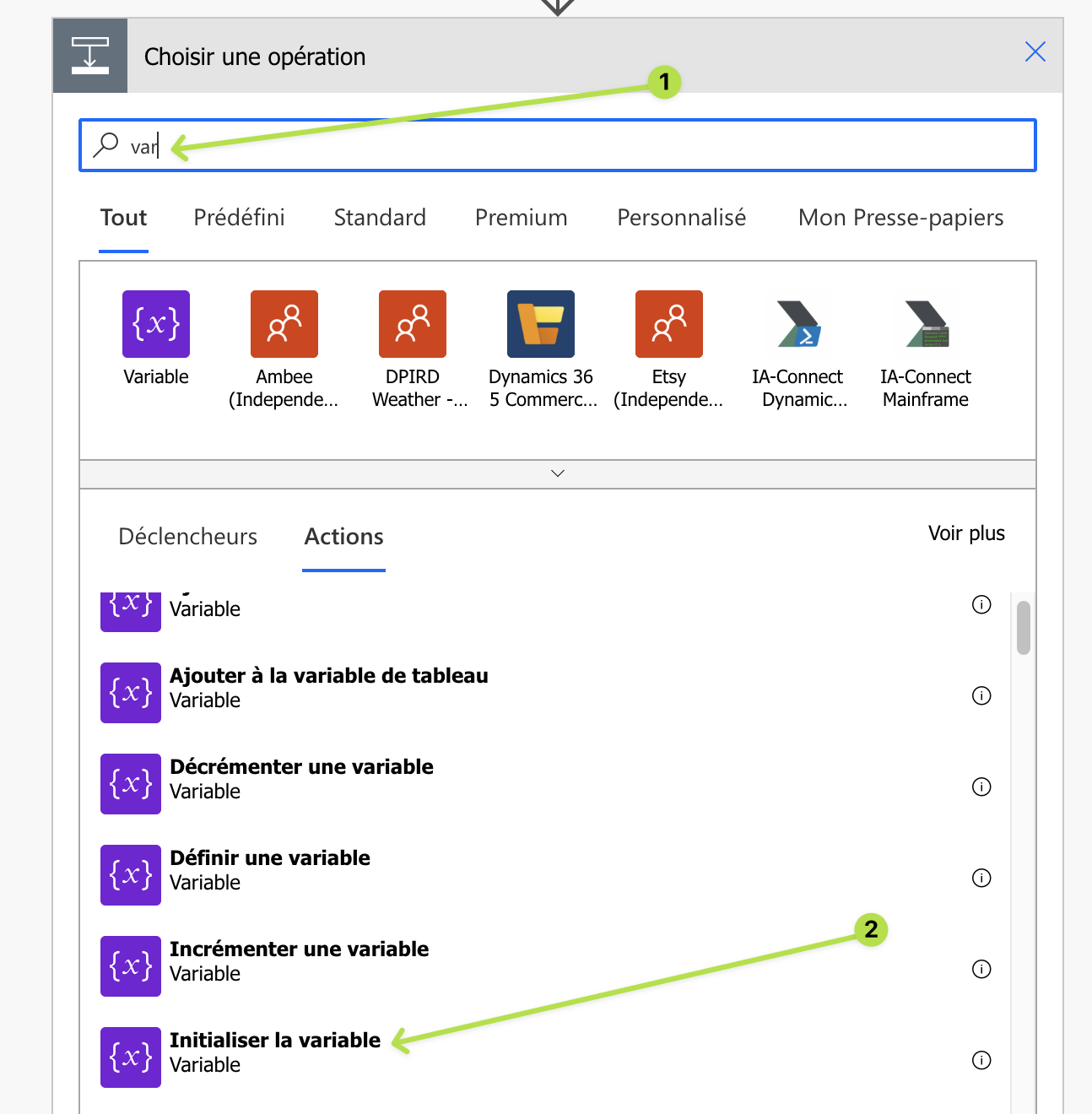 Ajoutez une action juste après Sélectionner PriorityID. Saisissez var dans le champs de recherche (1) puis sélectionnez Initialiser la variable (2).