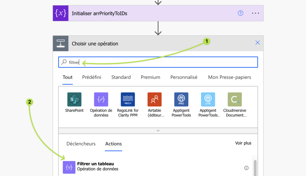 Ajoutez une action juste après Initialiser arrPriorityToIDs. Saisissez filtrer dans le champs de recherche (1) puis sélectionnez Filtrer un tableau (2).