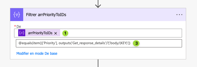 Dès lors, il convient de mettre à jour votre l’expression du bloc d’action Filtrer arrPriorityToIDs :