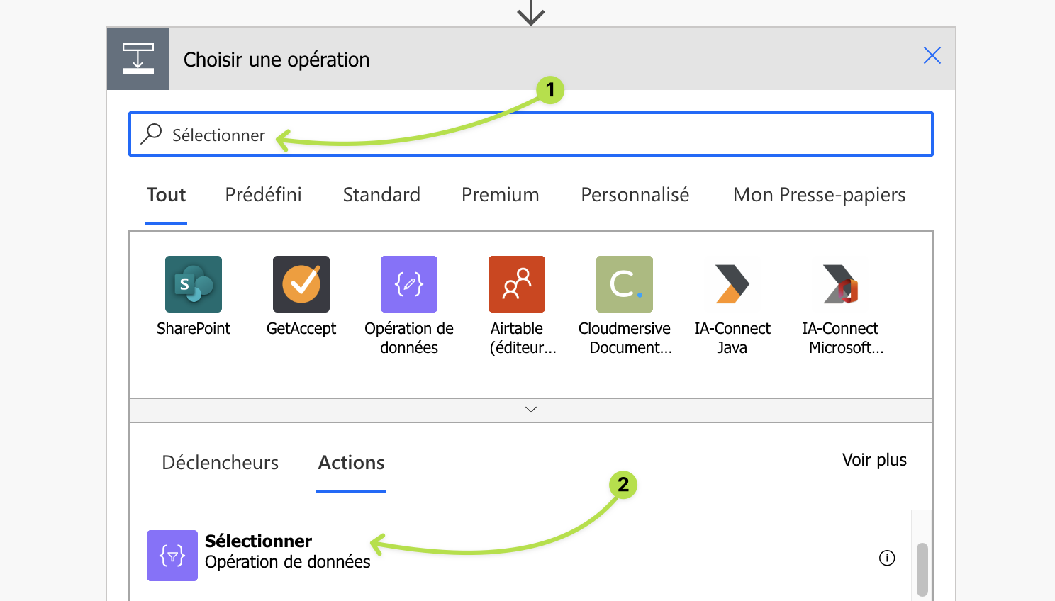Ajoutez une action juste après Filtrer arrPriorityToIDs. Saisissez Sélectionner dans le champs de recherche (1) puis sélectionnez Sélectionner (2).