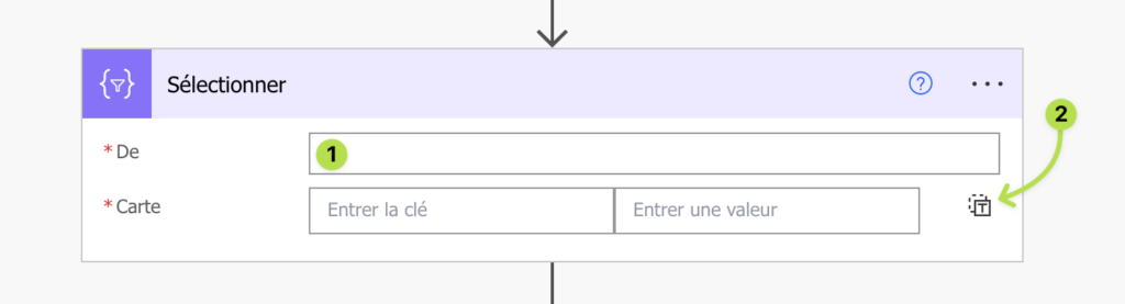 Cliquez sur le champs De (1) et sélectionnez le contenu dynamique Body de Filtrer arrPriorityToIDs. Cliquez ensuite sur le picto en bas à droite du bloc correspondant à Basculer carte en mode texte (2).