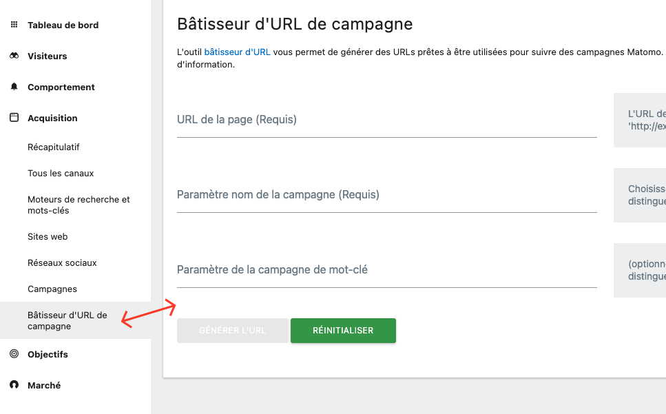 Matomo met à disposition un campaign builder afin de vous aider à générer des URLs avec la bonne syntaxe. Pour y accéder, allez dans la rubrique Acquisition, puis dans Bâtisseur d’URL de campagne.